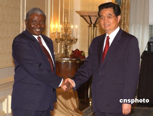 九月十四日,中国国家主席胡锦涛于出席联合国成立六十周年首脑会议时,在纽约华尔道夫酒店会见莫桑比克总统格布扎。作者:贾国荣