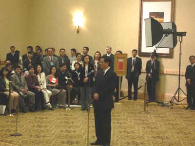 他说,我们此访加拿大的目的是,增进互信,促进合作,推动中加关系迈上新台阶。在访问渥太华、多伦多期间,我和克拉克林总督、马丁总理进行了会晤、会谈,就进一步发展中加关系深入交换了意见,达成了许多重要共识。我们一致认为,建交三十五年来,中加关系得到了长足发展,两国在各个领域的互利合作不断扩大,为两国人民带来了实实在在的利益。以经贸为例,建交时两国的贸易额只有一亿五千万美元,而去年已经达到了一百五十五亿美元,为建交时的一百倍。