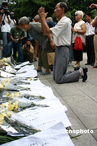 9月18日,南京大屠杀幸存者佘子清在侵华日军南京大屠杀遇难同胞纪念馆的哭墙前跪拜亲人。9月18日是“九·一八”事件74周年,又是中国传统的中秋节,南京大屠杀数十位幸存者来到侵华日军南京大屠杀遇难同胞纪念馆,祭奠亲人,悼念亡灵,呼唤和平。作者:阿董