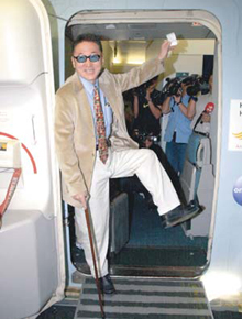 对于外传他不敢搭飞机,李敖说,他是勇敢的人,怎么可能会紧张,飞机恐惧症其实只是借口。陪李敖到大陆的小儿子,面对媒体也是力挺老爸,说爸爸是个勇敢的人,不会害怕搭飞机。 他说,拐杖是他的好朋友陈文茜送的,他出发前感觉身体有一样器官在阻挠,最后发现是右腿不听使唤,对于这个不听话的“极右派”器官,自己也拿它没办法。