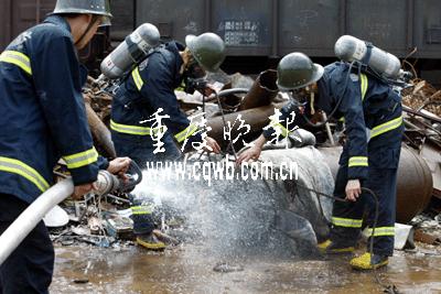 中新网9月20日电 据重庆晚报报道,昨天中午,重庆九龙坡区滩子口火车南站货场内,烈日当空。现场20余人汗流浃背,齐刷刷盯着列车旁的废铁堆:一大圆柱形铁罐正“哧哧”冒气,两名戴着空吸机的消防战士正用高压水枪为铁罐“退烧”。