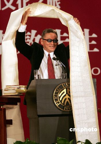 台湾知名人士李敖9月21日在北京大学演讲时,向听众展示他上千本被封杀的书籍目录,并引用中国成语“著作等身”自我开心。作者:任晨鸣