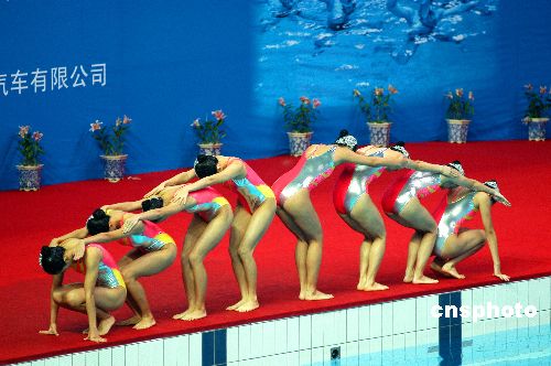 9月20日晚,十运会花样游泳集体项目的比赛,经过自由自选和技术自选的预赛后,江苏、四川、北京暂列前三名。来自澳门代表队也参加了该项目的比赛。 作者:刘建民