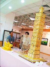 图:台南监狱展出用烟盒砌成的台北101大楼