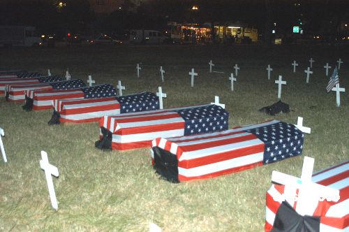 美国各地的反战者继周六举行大规模示威后,九月二十五日(周日)继续在华盛顿纪念碑旁边的大草坪上,以道具摆出覆盖美国国旗的棺材和十字墓碑,象征在伊拉克战场死亡的士兵,呼吁尽快结束战争,不要有更多的士兵为战争而死。作者:余东晖
