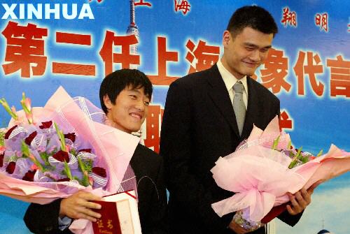 中新网9月27日电 今后,姚明和刘翔将共同代表上海的形象。新闻晨报报道,昨天,第二任上海形象代言人聘任仪式在市政府贵宾厅举行。上海市委副书记、市长韩正向象征着上海“高度”和“速度”的优秀运动员姚明、刘翔颁发了上海形象代言人的证书,任期2年,从昨天起至2007年9月26日。上海市委副书记殷一璀出席了聘任仪式。