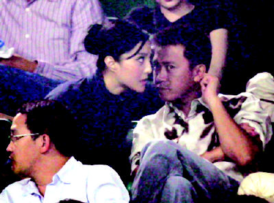 中新网9月27日电 据华商报报道,9月26日,中国网球公开赛女单决赛,被炒得沸沸扬扬的“兵冰恋”主角、绯闻情侣范冰冰和王学兵出现在观众席上。范冰冰穿一件朴素的黑色半袖衫,头发松松地挽起,王学兵则穿一件米色衬衫。两人边看球边亲密地“咬耳朵”,举止十分亲密,俨然一对甜蜜情侣。范冰冰看到精彩之处,忍不住大声欢呼,一旁的王学兵则不时含情脉脉地看着身边佳人。