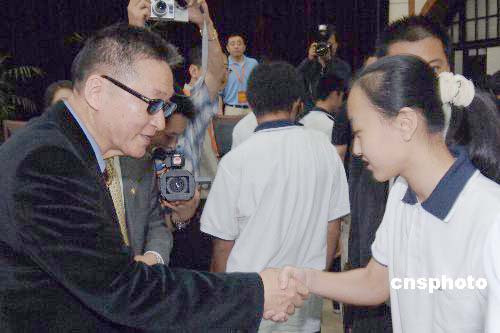 图:李敖与上海“小校友”亲切握手