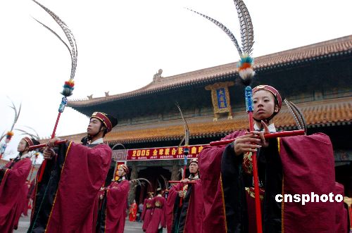 上午八时,在庄严肃穆的鼓乐声中,两千五百五十六名中国官方代表、各界人士代表、孔子、孟子、颜子、曾子后裔代表,以及来自海内外的祭孔参拜团成员,沿明代古城南门外神道进入曲阜内城,过至圣庙牌坊,穿圣时门、弘道门、大中门、同文门、奎文阁、十三碑亭进入大成门来到孔庙大成殿前,冒雨参加祭祀孔子大典。