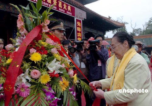 在绵绵不断的秋雨中,中国全国政协原副主席叶选平、全国人大常委会原副委员长王光英、中华民族文化促进会主席高占祥、山东省人大常委会副主任王道玉、省政协副主席林书香等,分别在孔庙大成殿前向孔子塑像敬献了花篮。