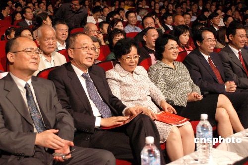 中国国务院侨务办公室主任陈玉杰(左三)、副主任刘泽彭(左二)、副主任李海峰(左四)、副主任赵阳(左一),九月三十日晚,出席由国务院侨务办公室和海外交流协会共同主办的“2005海外侨胞国庆专场文艺晚会”,并与来北京参加国庆观礼的海外侨胞一千余人共同观看演出。作者:邹宪