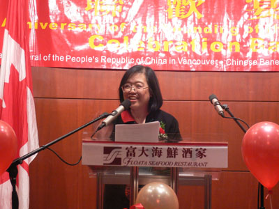 在今晚温哥华的晚宴上,中国驻温总领事田春燕致献词时介绍了新中国成立五十六年来所取得的伟大成就。对于中加双边关系,田春燕特别回顾了十多天前胡锦涛主席对加拿大进行的国事访问。她指出,胡主席访加期间,两国把双边关系提升为战略伙伴关系,确定二0一0年双边贸易额要突破三百亿美元,同时签署了七个合作协定。田春燕表示相信,通过双方共同努力,两国的合作将迎来美好的未来。