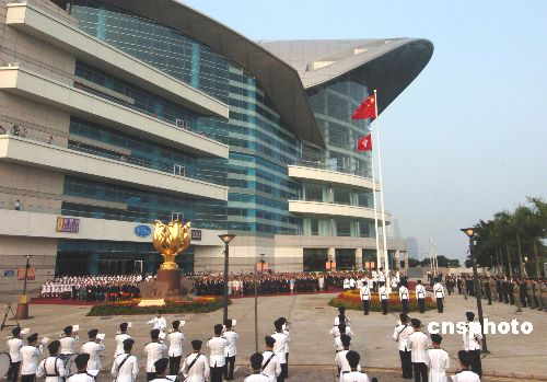 香港特别行政区庆祝中华人民共和国成立五十六周年升旗仪式1日早8时在金紫荆广场举行。作者:赵振清