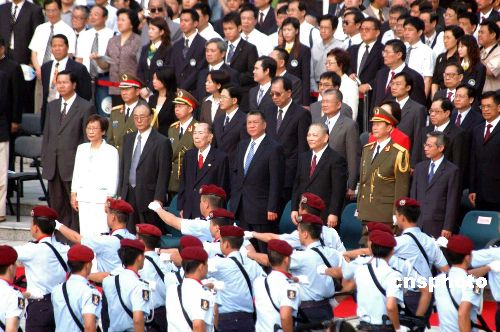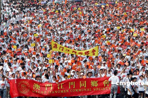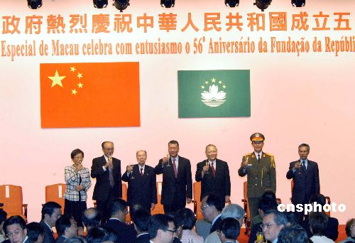 中新社澳门十月一日电(记者 黄鸿斌)十月一日清晨,数万名喜气洋洋的澳门居民,迎着初升的太阳参加丰富多彩的贺国庆、喜迎东亚运各项活动。澳门特区政府上午八时由行政长官何厚铧主礼,在新口岸金莲花广场举行升旗仪式。中联办、外交部驻澳特派员公署、解放军驻澳部队代表,以及澳门特区立法及司法机关负责人、政府主要官员及社会各界代表出席观礼;下午四时,特区政府在旅游塔会展娱乐中心举行盛大酒会,社会各界同庆中华人民共和国成立五十六周年,行政长官在酒会上致词及向来宾祝酒。