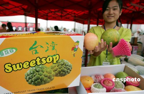 2005年10月1日,首届台湾美食文化节在北京朝阳公园举行,来自台湾地区的众多美味佳肴亮相展会。图为商家展示花样繁多的台湾水果。作者:武仲林