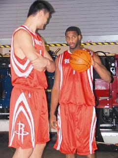 第一天开门见客,丰田中心里顿时乱成一团,闹得麦克格雷迪连拍照的耐心都没有了,一直向摄影师抱怨;姚明的脑袋也被闹糊涂了。问起他四年来在NBA最大的进步是什么的时候,他居然脱口而出:“是英文吗?”让人啼笑皆非。