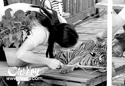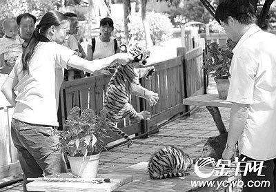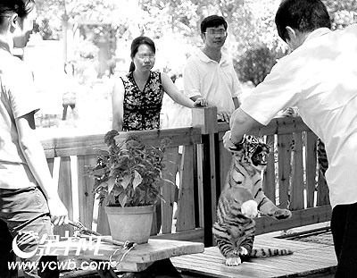 昨日上午,广州动物园内人流如潮,孩子们在家长的带领下与许多动物较近距离接触。然而,在动物园中心地带,为了让幼年老虎与游客合影留念,工作人员强迫幼虎摆着各种姿势。小老虎如果不顺从,就遭到鞭抽、揪耳等种种虐待。引来一些孩子的惊呼和家长的不满,不少小朋友不愿小老虎挨打而打消了和其合影的念头。