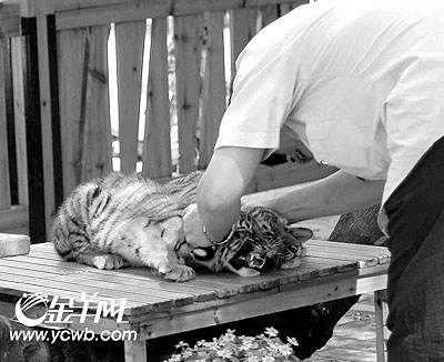 记者在现场看到,在与幼年老虎合影留念处,工作人员让两只幼年老虎配合游人合影,把它们放在约一平方米的木台上,只要小老虎稍有离开木台的行为,工作人员就使出各种“伏虎”手段。在约半个小时内,就有两只幼年老虎到多次不同程度的虐待,而且虐虎招数五花八门,有的工作人员双手抓虎摔,有的泰山压顶按虎头,还有的用竹鞭抽虎鼻,揪单只虎耳上提,甚至用巴掌掴虎脸。