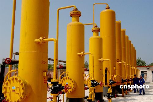 中国石化集团公司已经将天然气产业作为重点产业加以发展,先后在新疆、四川、内蒙古等地获得了重大发现,呈现出储量、产量、同步增长的良好势头。图为2005年国庆节期间中原油田天然气产销厂文留4号集气站职工对生产设备进行巡检。作者:胡庆明