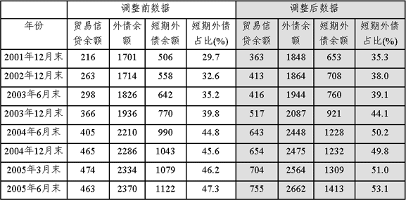 2001-2005年6月末贸易信贷统计方法调整前后外债有关指标对比