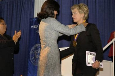 中新网10月9日电 据印度联合新闻社报道,当地时间10月8日,美国前第一夫人,现任纽约州联邦参议员希拉里-克林顿与其她9名女性一同入选全美妇女名人堂。评审工作由全美评审委员会负责,主要评价她们在艺术、运动、商业、教育、从政、人道、慈善和科学方面所作出的贡献。