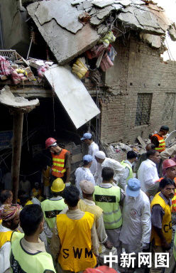 巴基斯坦拉合市的居民与救援人员站在一栋在地震中损毁的多层建筑废墟之中。