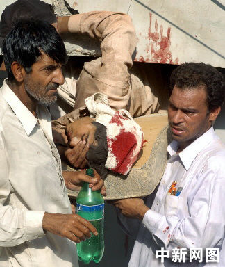 巴基斯坦救援人员抱着一位在坍塌建筑中的受伤人员。