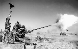 中新网10月11日电 综合解放军报报道:金秋季节,新疆军区某实弹战术演练现场阵地上实兵实弹战术对抗激战正酣。记者在某高炮旅射击阵地上看到,某型“敌”歼击机临空,官兵们沉着应战,果断采用新战术击中目标。指挥演练的旅长李林称,用此战法击中空中目标,在该旅还是第一次。