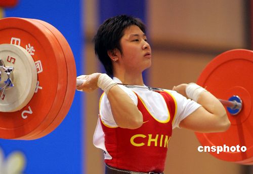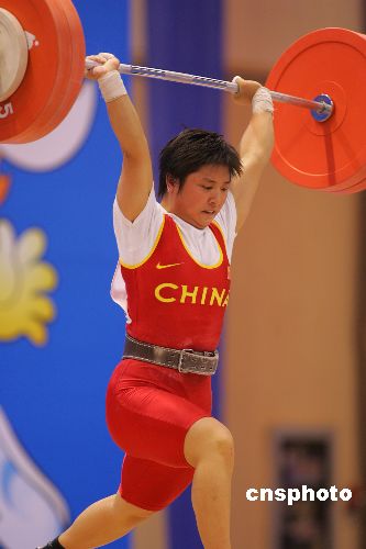 十月十日,第十届全国运动会女子举重比赛在苏州开赛,湖南“女大力士”们在第一天的比赛中连创佳绩,两超世界纪录。先是杨炼在女子四十八公斤级比赛中以总成绩二百一十五公斤超了该项目总成绩二百一十公斤的世界纪录,接着十七岁小将李萍又以总成绩二百三十公斤超了五十三公斤级的世界纪录。图为李萍在比赛中。作者:汤彦俊