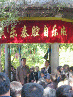 二弦、击板、唢呐等几把简单的乐器是全部的道具,四五个人在那里“圈”上一块“地盘”,不着专业的戏装,就随心所欲的唱起来。最为规模的非公园凉亭上的那场子莫属,艺人们坐在供游人歇憩的古式凉亭边吹、拉、弹、敲,演唱者站在亭子中央,摆出标准的舞台架势,扯开嗓子亮着腔,无比的慷慨激昂。