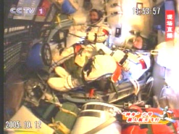 北京时间十五时三十分许,北京航天飞控中心向航天员飞行乘组了解了飞船工作情况和各自的身体状况,随后,两名航天员按照地面指令关闭了航天服头盔的面窗,航天员向地面报告:“飞船工作正常,已做好变轨准备。”