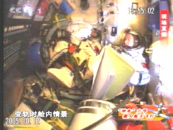 北京时间十五时五十四分,北京航天飞控中心启动飞船变轨工作程序。记者看到,飞控大厅大屏幕上的实时三维动画显示,飞船尾部喷出桔黄色的火焰,飞行加速。六十三秒后,飞船又进入了平稳的飞行状态。航天员向地面报告:“仪表显示飞船变轨结束,完毕。”随后,正在南太平洋上的“远望”二号测量船向北京航天飞控中心传来数据,表明变轨取得圆满成功。