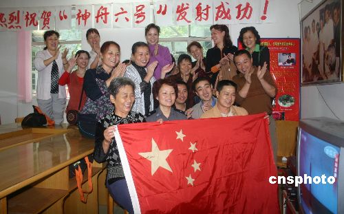 10月12日,湖北省武汉市江汉区汉兴街常二社区居民们,兴高采烈来到社区集中收看了神舟六号载人飞船发射升空的实况,9点钟当神舟六号载人飞船发射成功后,居民们欢呼雀跃喝彩。作者:李长林