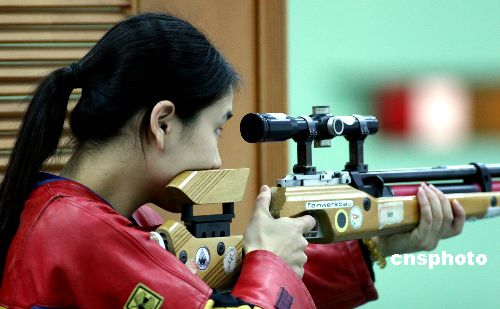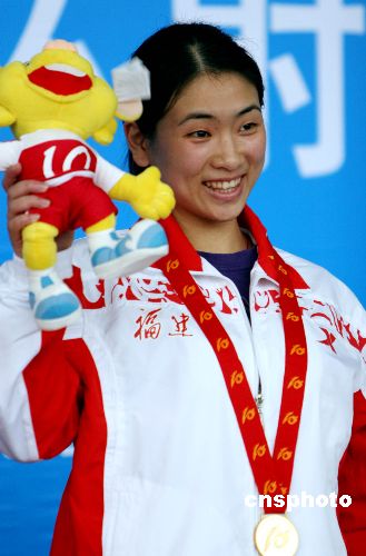 10月14日下午,十运会女子移动靶比赛在江苏方山体育训练基地举行,福建选手李雪艳以0.1环的优势夺得冠军。图为李雪艳在比赛中。作者:蒋振江