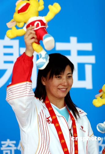图:河北选手张亚菲射落十运会女子双多向飞碟金牌