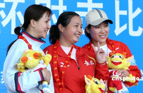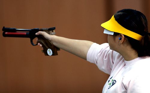 10月16日中午,十运会女子气手枪决赛在江苏方山体育训练基地举行,安徽选手胡军以484.7环的成绩夺得冠军。图为胡军在比赛中。作者:蒋振江
