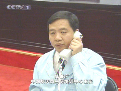 十九时五十九分,远望四号捕获飞船。北京航天飞行控制中心调度员通报:“神舟六号,下面由中国航天员科研训练中心主任陈善广与你们通话。”