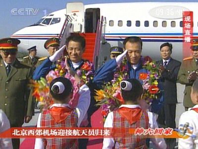 中新社北京十月十七日电 今天九时三十分,载着两位航天员费俊龙和聂海胜的专机在北京西郊机场平稳降落。中共中央政治局委员、中央军委副主席、国务委员兼国防部长曹刚川在现场迎接航天员的归来。