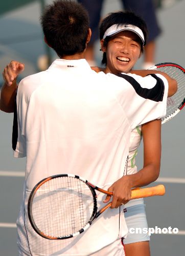 十月十七日,湖北选手、雅典奥运会冠军李婷与队友朱本强以二比零击败解放军组合刘婉婷、卢昊,夺得十运会网球混双金牌。作者:王东明