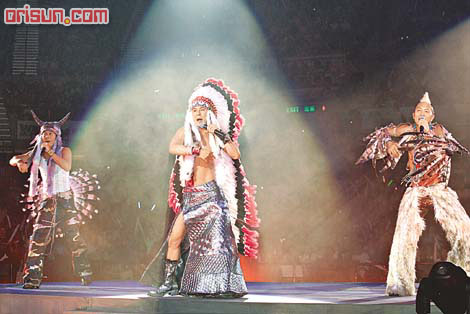 中新网10月20日电 据香港媒体报道,草蜢复出乐坛举行三场《我们的演唱会》昨晚开锣,入座率九成。三子以一身红番look出场,蔡一杰着透视衫上阵,明显露一点,抢尽风头。