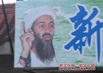 记者到互联网上找到了一张拉登非常有名的图片,跟招牌上的表情、动作甚至手表都完全相同,只是照片上的拉登穿着迷彩服,而招牌上的穿着白色外衣。据从事电脑平面设计的工作人员讲,通过技术处理,给拉登换件衣服是轻而易举的事。