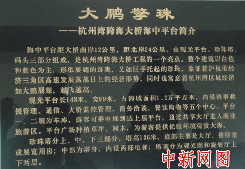 宁波杭州湾大桥在其中部偏南的位置设有一个1万平方米的海上平台,它将通过"桥上架桥"的方式与大桥相连,这在中国的建桥史上尚属首创。据介绍,在大桥施工阶段,海上平台将为施工队伍提供生活保障,同时它还具有救助及管理基地的功能;大桥建成后,这一海上平台将被改造成兼具旅游观光功能的救援平台。平台上将架设观光塔,游客既可俯视波涛汹涌的杭州湾,饱览海上风光,也可以鸟瞰大桥雄姿。