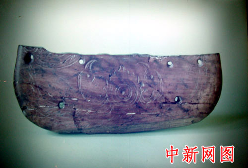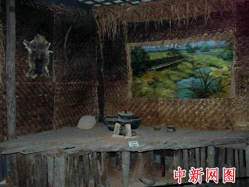 图三:反映河姆渡人“定居生活”和“原始艺术”两个内容。陈列着被称为是建筑史上奇迹的带有榫卯的干栏式建筑木构件和加工工具。借助干栏式建筑遗迹的巨幅照片和干栏式建筑复原模型,你可领略7000年前干栏式长屋的古代建筑群风采。最大的那幢木屋面宽23米,进深7米,梁柱榫卯相接,结构奇巧,气势恢宏,蔚为壮观,在这里我们已经能看到后世那宏伟浩大,精致辉煌的殿宇楼阁的雏型。