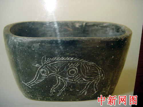 图二:河姆渡遗址出土的原始艺术品,集中地反映了河姆渡先民丰富的艺术想象、朴实的精神追求和高尚的审美观念。绝大多数是以装饰艺术出现的,即在实用的生活用器表面装饰上花纹或雕刻成图象,既实用又美观,不仅数量大,门类齐全,技法多样,而且题材广泛,造型独特,内容也丰富多彩。河姆渡雕刻艺术品的材料相当讲究,有象牙、骨、木和陶器等,设计奇巧,寓意更是十分深奥。在陶器、木器、骨器上可以见到刻划整齐的几何纹,庄重大方,刻工精细。制陶中信手的捏塑,写实性强,手法夸张,想象丰富,富有浓郁的生活气息。如双燕比翼齐飞,小狗饱食后小憩,家猪笨窘之态可掬,肥羊匍匐,游鱼腾跃。陶器上刻划的一株株对称的稻穗,粗壮有力,极富生气;另一件陶钵外壁光滑,上刻一头猪,低头拱嘴,栩栩如生表现出河姆渡先民祈求稻谷丰收,家畜兴旺的美好愿望。