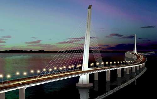 信道上两座斜拉桥的桥塔互仰向对方,形态犹如两座桥塔互相牵引各自的高架引道,至中间的深港分界线,象征着两地人民热切渴望能更加紧密的团结起来,迈向繁荣,促进两地的经济,并成为后海湾的地标。