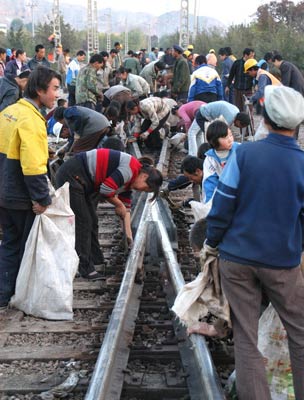 10月23日清晨6时30分,位于永登县苦水镇的兰武二线原大路车站正式停止了使用。上午9时30分,当距离车站南侧百余米的新兰武二线大路车站正式投入使用后,原车站弃用的660余米长的铁路顿时成了当地沿线百余村民哄抢、偷窃的目标。