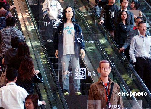 24日,香港时代广场举办“Kidult节—3人展”,邀请国际知名艺术家展出他们的人形公仔作品。图为8个1比1的搪胶人形公仔放置在扶手电梯侧,十分抢眼。作者:谭达明
