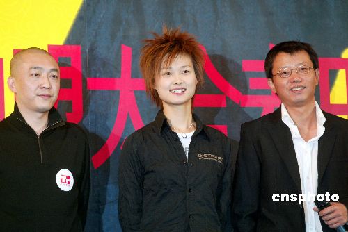图为太合麦田传媒总经理宋柯(右一)、李宇春、天娱传媒的总经理王鹏(左一)出席发布会。作者:韩艺冰