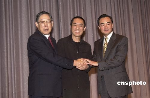 图为担任本届东京电影节评委会主席的中国著名导演张艺谋、中国驻日大使王毅和日本经济团体联合会会长奥田硕出席有关活动。 作者:王健