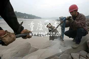 长江重庆工程局工程处胡鹏飞说,以前,受技术条件限制,炸礁石经常放“裸炮”。将炸药包用绳子捆住,固定在水下礁石上,利用水的压力炸毁礁石。每次炮响之后,激起的水花达几十米高,冲击波在水里传递很远,炸死的鱼儿达几十公斤。有一次还炸死了两条中华鲟,每条重量60多公斤。这次爆破,将在礁石上打孔,将炸药灌到孔里爆破,减少对水的冲力。(刘邦云)